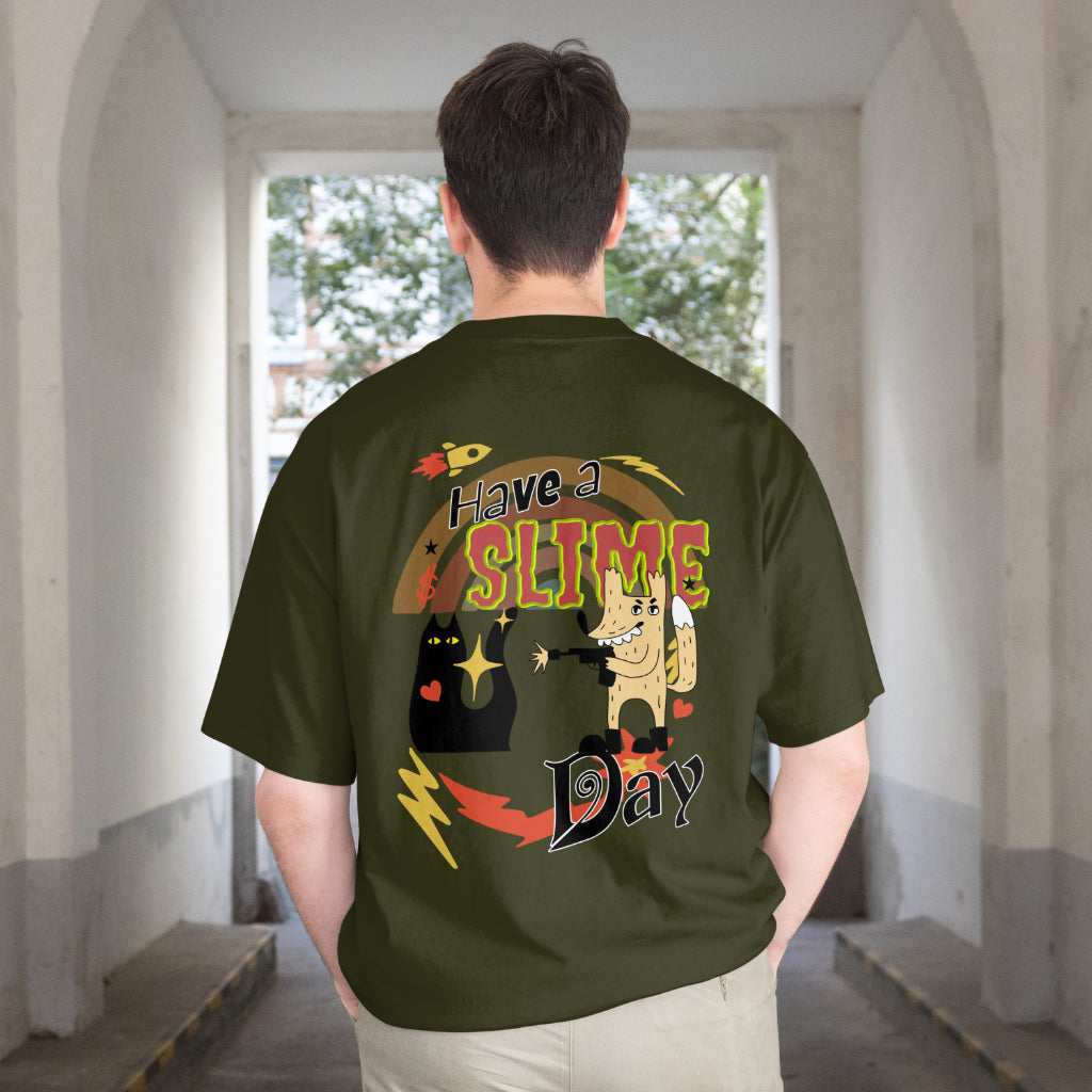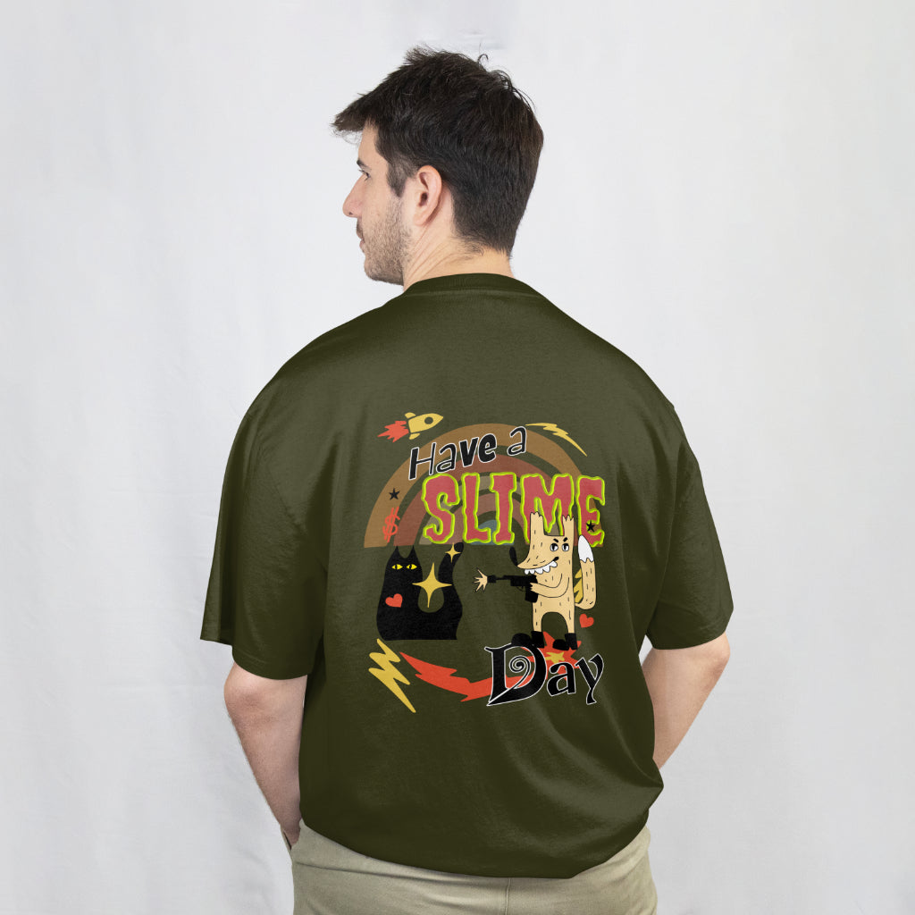 Elevate your everyday drip with this Olive Green “Slime Day” Oversized T-Shirt, crafted from 100% pure cotton for maximum comfort and breathability. With its bold front text and funky, eye-catching cartoon print on the back, this tee screams street-style with attitude. Made from premium 220 GSM fabric, it offers a heavyweight feel and a perfect drape that holds shape. Whether you're hitting the streets or chilling with friends, this tee ensures you stand out – in style and comfort.